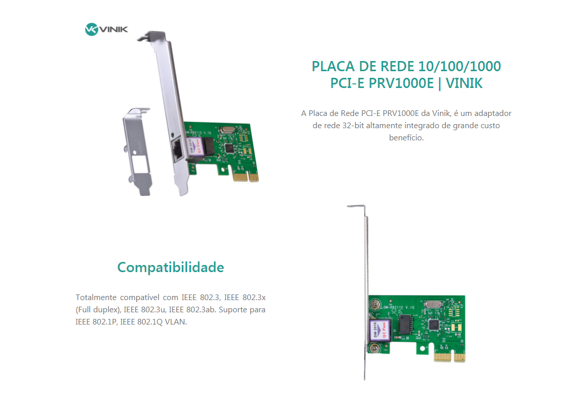 - Padrões: Compatível com IEEE 802.3, IEEE 802.3x (Full duplex), IEEE 802.3u, IEEE 802.3ab. Suporte para IEEE 802.1P, IEEE 802.1Q VLAN