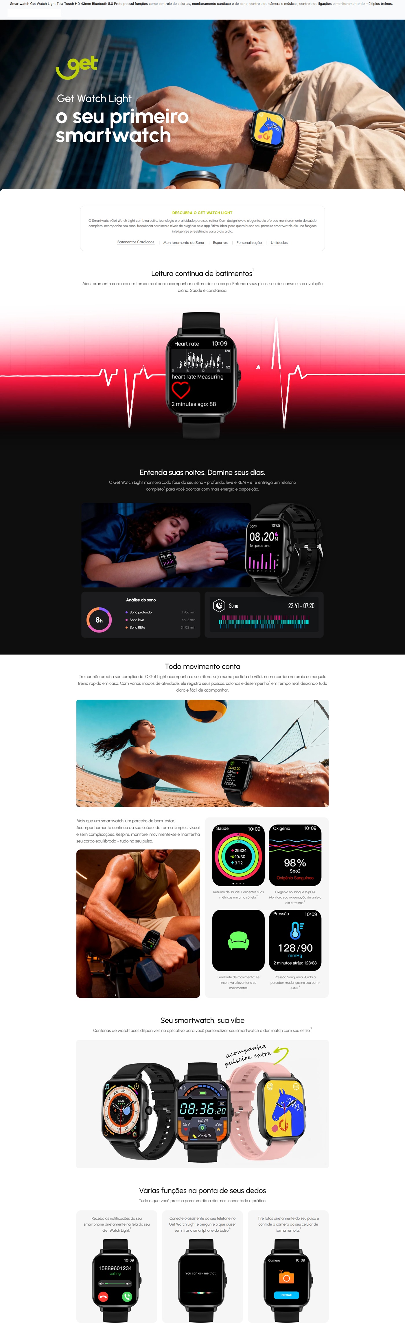 Smartwatch Get Watch Light Tela Touch HD 43mm Bluetooth 5.0 Preto possui funções como controle de calorias, monitoramento cardíaco e de sono, controle de câmera e músicas, controle de ligações e monitoramento de múltiplos treinos.