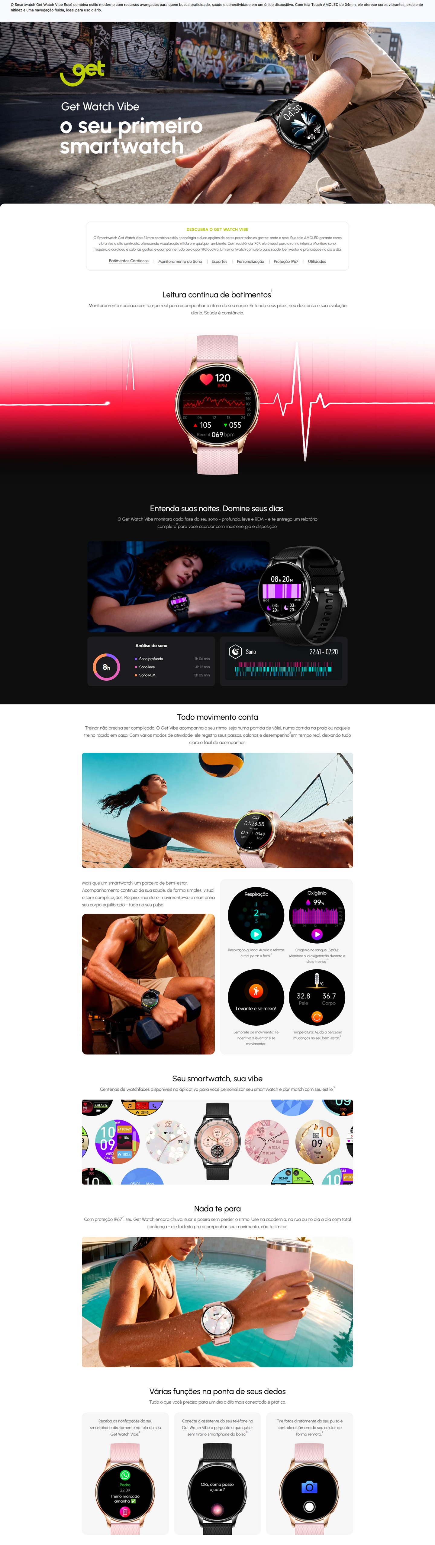 O Smartwatch Get Watch Vibe Rosê combina estilo moderno com recursos avançados para quem busca praticidade, saúde e conectividade em um único dispositivo. Com tela Touch AMOLED de 34mm, ele oferece cores vibrantes, excelente nitidez e uma navegação fluida, ideal para uso diário.
