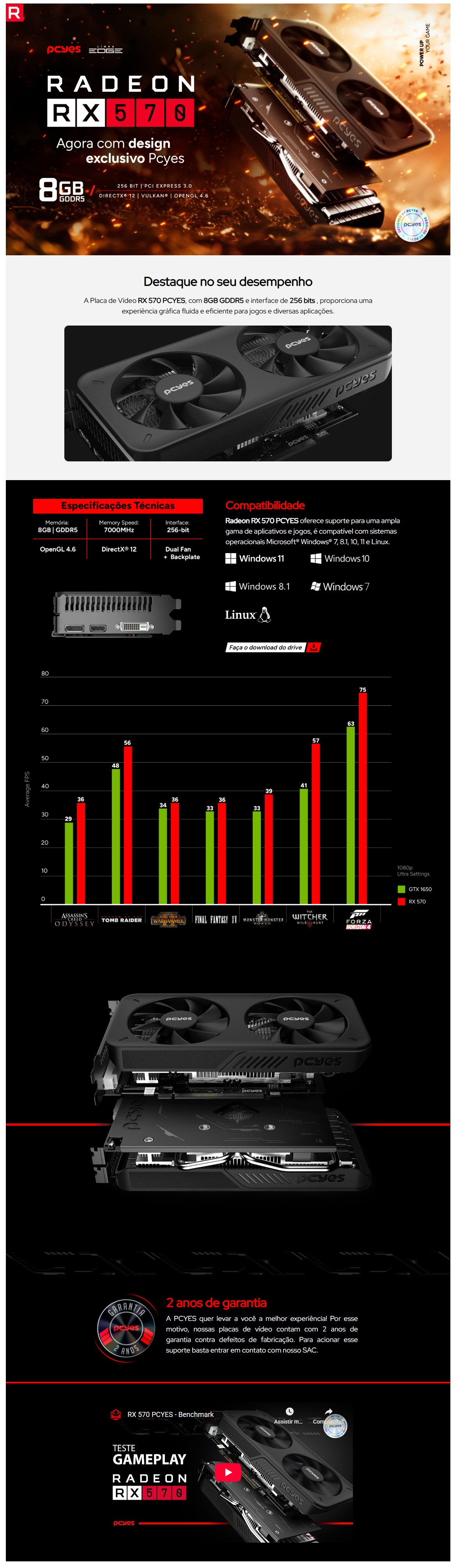 - A placa de vídeo RX 570 8GB é a solução perfeita para gamers que desejam rodar jogos atuais com boa qualidade gráfica e fluidez, sem gastar muito. Perfeita para upgrades e montagem de PCs Gamer.