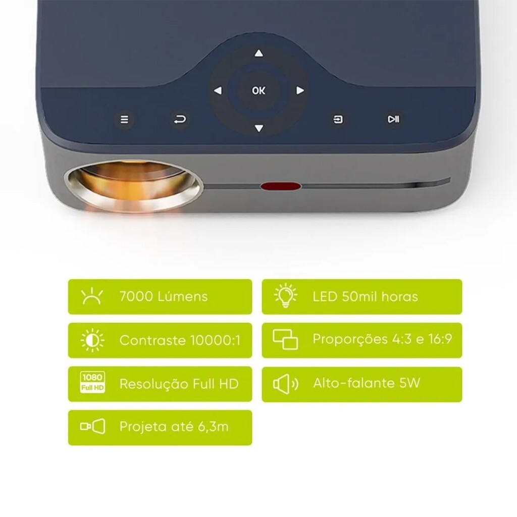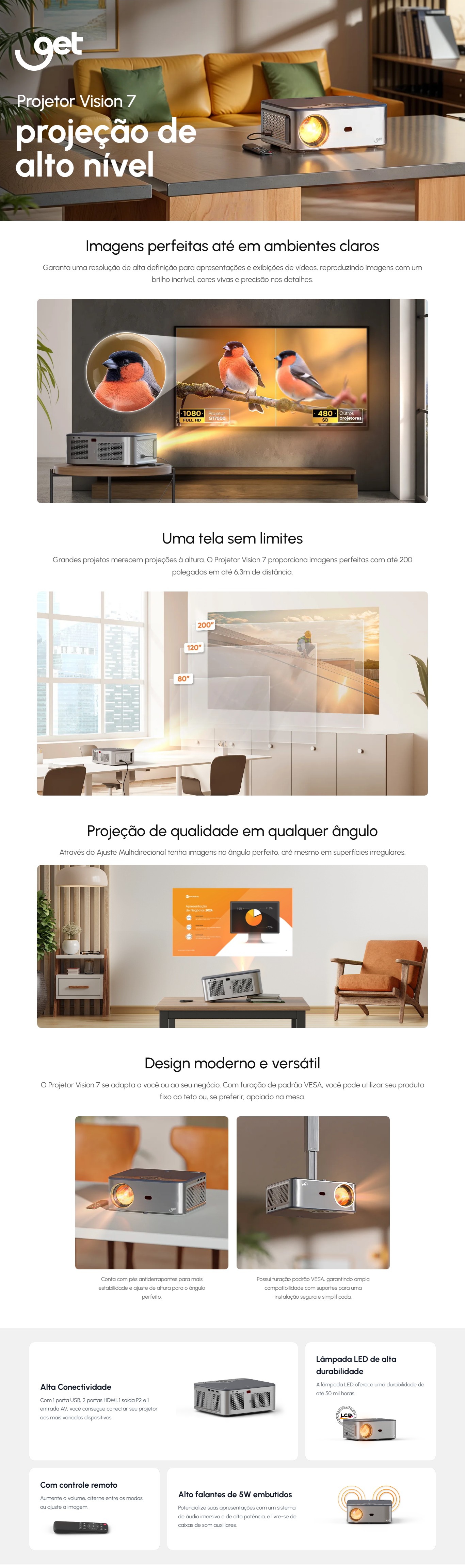 - Projetor Multimídia Get Vision 7000 Lumens Full HD conta com entradas HDMI, USB e AV, suporta projeções de até 250" além de resolução Full HD, contém também lâmpada LED com 50mil horas de duração.