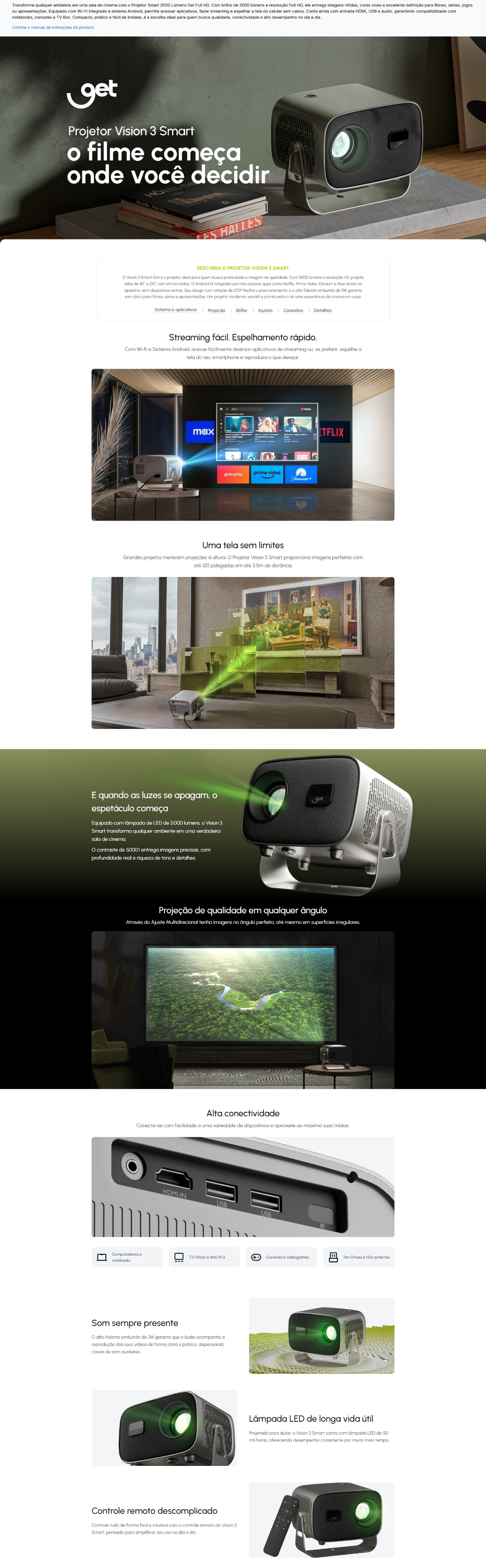 O Vision 3 Smart Get é o projetor ideal para quem busca praticidade e imagem de qualidade. Com 3000 lúmens e resolução HD, projeta telas de 40" a 210" com ótima nitidez. O Android 13 integrado permite acessar apps como Netflix, Prime Video, Disney+ e Max direto no aparelho, sem dispositivos extras. Seu design com rotação de 270° facilita o posicionamento, e o alto-falante embutido de 3W garante som claro para filmes, séries e apresentações. Um projetor moderno, versátil e pronto para criar uma experiência de cinema em casa.