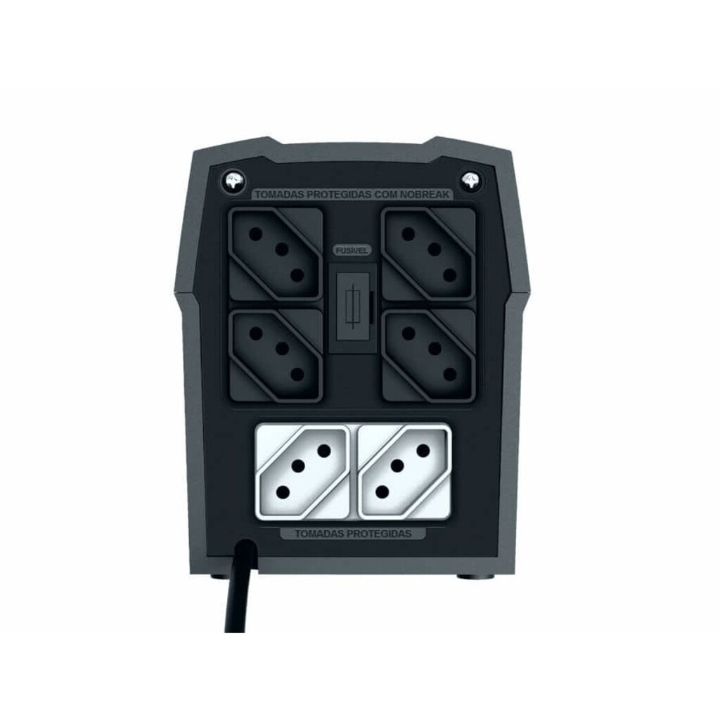 - Disponível nas versões bivolt automático de entrada ou monovolt 115V, ambos os modelos contam com saída 115V. São seis tomadas de 10A, sendo quatro com função nobreak, que continuam alimentando seus equipamentos essenciais na falta de energia, e duas tomadas auxiliares, ideais para dispositivos não prioritários. Todas as tomadas contam com filtro de linha e proteção contra surtos, subtensão e sobretensão.